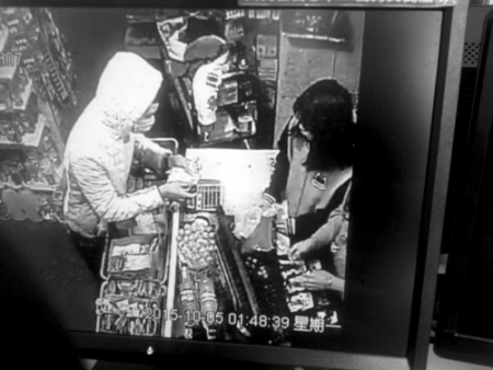 因为没有顾客,吴丽坐在收银台前摆弄着手机。戴口罩男子再次出现在超市里。口罩男子扒拉开收银台旁边的货架,“抢劫!”吴丽还没反应过来,口罩男子一把抢过吴丽桌上的手机放进了自己左上衣兜里。