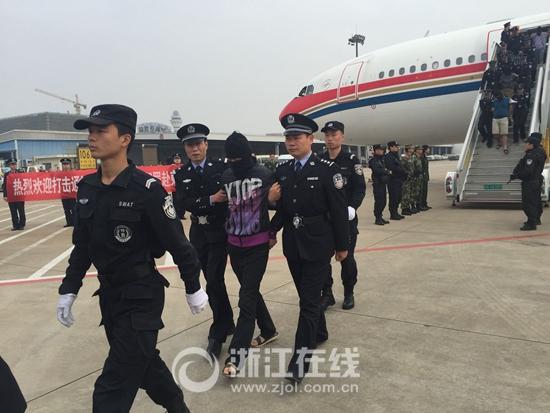 今天早上9点30分许,MU7060航班从柬埔寨金边抵达杭州萧山国际机场,86名浙江民警押解着78名犯罪嫌疑人从舱门走出。
