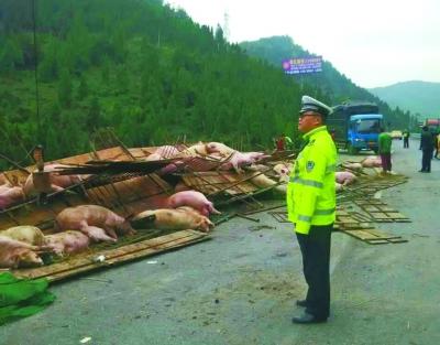 据了解,昨天凌晨2点半左右,遵义市公安交通管理局兰海高速大队四中队在接到报警后赶赴现场,发现一部分生猪被甩出车外,躺满道路。一部分活猪从货厢铁栅栏的破损处逃出来后在路上乱蹿,导致交通中断。