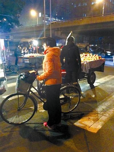 11月14日晚6点,双井桥西北角路口,摊贩随意挤占人行道。