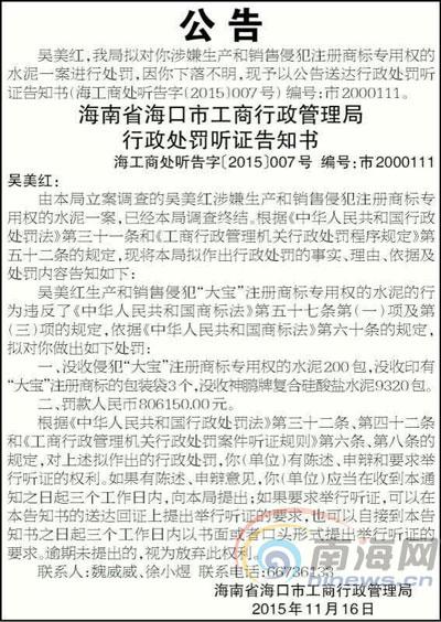 据了解,海口市工商局介入调查后,经最后清点,现场查扣已经装好的印有“大宝” 注册商标的水泥200包和用于制假的原料神鹏牌复合硅酸盐水泥9320包。目前,工商部门已经作出决定,拟对当事人吴美红处罚人民币806150元,没收涉案物品。