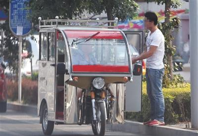 约20分钟后,一辆“三轮车”在路边停稳,司机50岁上下,敞怀穿一件蓝色的无衔制服,下身穿短裤、布鞋。司机侧过头,冲李栋招了招手,示意他上车。