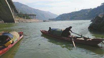 在雅砻江与金沙江交汇处,渔民准备出发打渔。