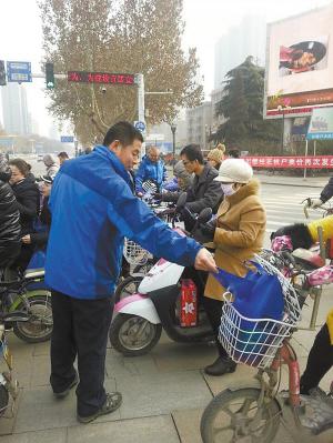 ■邯郸水上义务救援队志愿者在街头散发宣传单。记者 杨伟广 摄