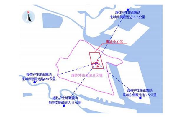 严重受损区在不同方向距爆炸中心最远距离为:东3公里(亚实履带天津有限公司),西3.6公里(联通公司办公楼),南2.5公里(天津振华国际货运有限公司),北2.8公里(天津丰田通商钢业公司)。中度受损区在不同方向距爆炸中心最远距离为:东3.42公里(国际物流验放中心二场),西5.4公里(中国检验检疫集团办公楼),南5公里(天津港物流大厦),北5.4公里(天津海运职业学院)。受地形地貌、建筑位置和结构等因素影响,同等距离范围内的建筑受损程度并不一致。