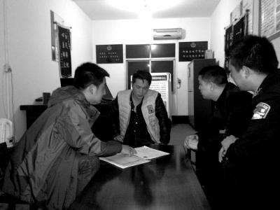 3月30日晚,在滔河镇派出所内,达州通川区朝阳派出所所长、副所长在岚皋县滔河镇派出所所长的陪同下,向王涛(左二)介绍此事的上报情况。
