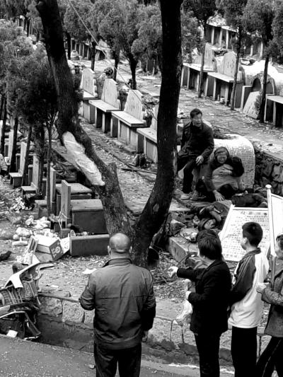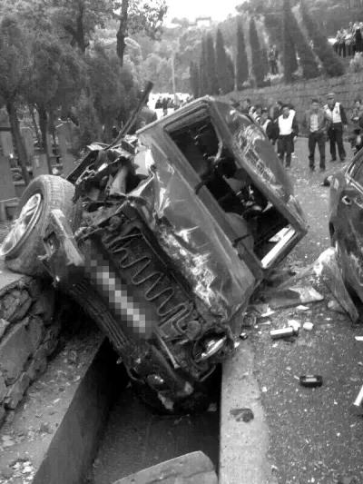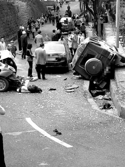 从 事故现场照片看到,一辆黑色奔驰越野车侧翻在路边,车头变形,前挡风玻璃破碎,车体右侧有明显凹陷;一辆银灰色的小轿车右后车门及后备厢受损;还有1辆黑 色小轿车车身受损,路面上散落着大量车体碎片,有1名伤者躺在地上,在靠近路口的一侧公墓旁,一位老奶奶抱着一个穿红衣服的小孩在哭泣。