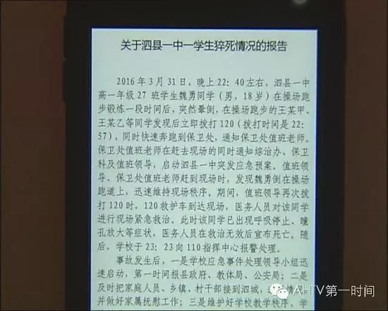 记者了解到,3月31号晚上,泗县警方在接到报警后,10点56分来到了泗县一中操场,并在医生宣布魏某死亡后,对现场进行了勘查。泗县公安局刑侦大队大队长许正峰告诉我们,警方赶到现场时,尸体俯卧在操场地面上,周边没有发现可疑痕迹,尸体衣着完整。只是看到死者面部有擦伤的痕迹。