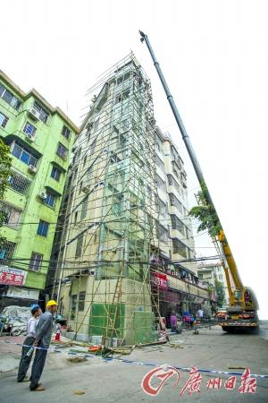 昨天下午,违建电梯正在拆除中。该建筑楼高7层,1~6楼已出租,7层是业主自住,一楼铁门直通电梯门,电梯只停1楼和7楼。 广州日报记者 苏俊杰摄