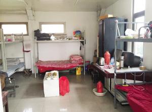昨天,记者来到了位于郁江道沿线的绿道公园。从东侧大门口沿着铁轨步道往西走了约500米,见到一幢造型新颖的木质结构公厕。但公厕大门紧锁,透过一扇开启的窗户看到,里面部分设施损坏,洗手盆上覆盖着灰土,看上去很久没用过了。继续沿着步道往西走了约400米,同样一幢木质结构公厕出现在路边,这处公厕大门是敞开的。可进入大门后却发现,值班室内竟然摆着一张床,床上还有被褥。残障洗手间内摆着一台洗衣机,机盖上堆着还未清洗的衣服。男厕所内竖着电暖气和一台除草机。公厕右边的一间屋子里摆着4张上下床,床边还有电视,一张长条桌上还有新出锅的饭菜。