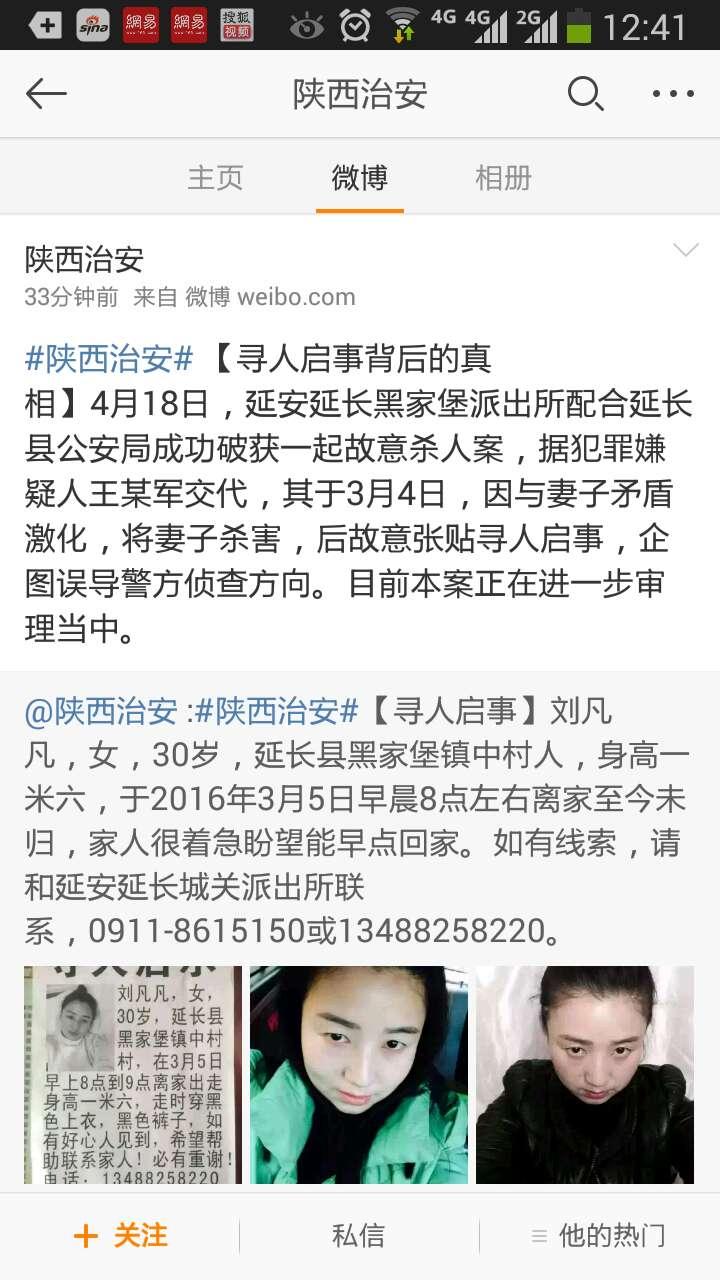 据陕西省公安厅治安管理局今日通报,【寻人启事背后的真相】4月18日,延安延长黑家堡派出所配合延长县公安局成功破获一起故意杀人案,据犯罪嫌疑人王某军交代,其于3月4日,因与妻子矛盾激化,将妻子杀害,后故意张贴寻人启事,企图误导警方侦查方向。目前本案正在进一步审理当中。