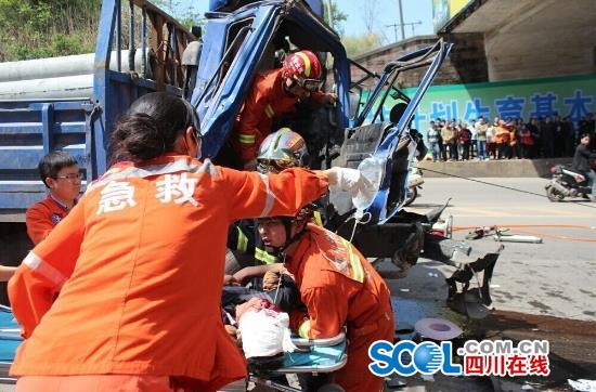 消防官兵到达事故现场后,发现现场一片狼藉,一辆运载电线杆的大货车车头严重变形,车头有些漏油,车内有两名男子被困在严重变形的驾驶室内动弹不得,满面鲜血不时还发出痛苦地求救声。医护人员已经在现场进行初步治疗。