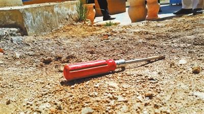 4月18日13时许,兰州晨报记者来到事发楼下,看到地面上有一大片血迹,不远处的花园内遗留着一把带有血迹的五寸长木柄螺丝刀。据住户讲,当日11时许,一名两岁小男孩在楼下玩耍时,19楼坠下一把螺丝刀不偏不倚插入孩子的颅脑。记者随后上19楼了解情况,靠右手一家住户无人回应,另一家表示不知情。