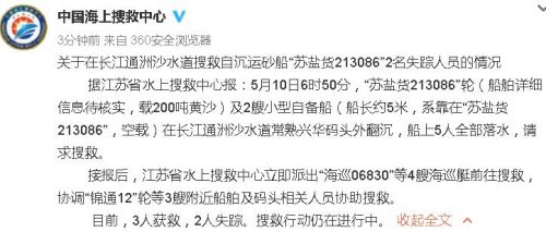 中新网5月10日电 据中国海上搜救中心官方微博消息,根据江苏省水上搜救中心报:5月10日6时50分,“苏盐货213086”轮(船舶详细信息待核实,载200吨黄沙)及2艘小型自备船(船长约5米,系靠在“苏盐货213086”,空载)在长江通洲沙水道常熟兴华码头外翻沉,船上5人全部落水,请求搜救。