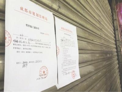 昨日下午,该店铺的卷帘门已经关闭,上面贴上了成都市规划管理局下发的暂停施工和执法调查两份通知书,明确提出该店铺的修建涉嫌挖地下宅,现场不能提供建设工程规划许可证,涉嫌违法建设,根据《中华人民共和国城乡规划法》规定,涉嫌违建的个人或受益人立即暂停施工,并于今日上午11点前,带上相关材料到成都市规划执法监督局接受执法调查,并尽快将挖空的地层填平恢复原貌。