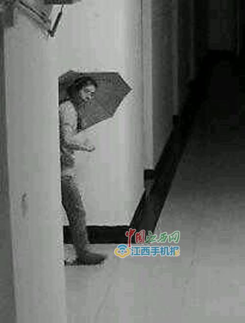 从该校女生提供的监控视频图片上可以发现,14日凌晨3时33分,监控中一名男性鬼鬼祟祟地出现在3楼走廊,此时走廊上空无一人,此人蹲在宿舍门前。此外,在其他多个楼层也出现一名撑着伞的男子。
