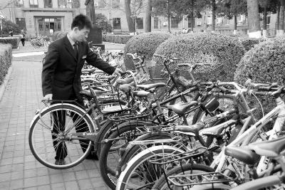宋保印在整理教学楼前停放的自行车 摄/记者 张丽