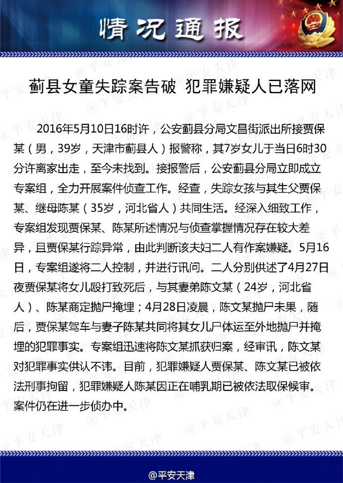 参与互动 天津北方网讯:从“平安天津”微博了解到,2016年5月10日16时许,公安蓟县分局文昌街派出所接贾保某(男,39岁,天津市蓟县人)报警称,其7岁女儿于当日6时30分许离家出走,至今未找到。接报警后,公安蓟县分局立即成立专案组,全力开展案件侦查工作。经查,失踪女孩与其生父贾保某、继母陈某(35岁,河北省人)共同生活。