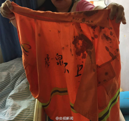 15日,重庆,女环卫工徐尚明劝告女子谢某不要乱丢瓜子壳时,竟被对方甩了一记耳光!随后,谢某还脱下高跟鞋,连敲徐尚明头部,致徐头破血流。目前,谢某被依法治安拘留5天、罚款200元。(央视记者王宏超)