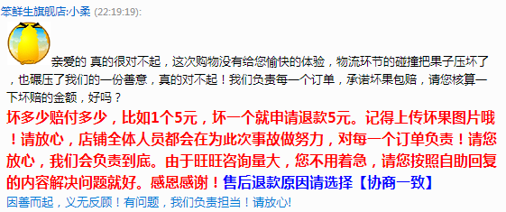 “笨鲜生”在旺旺的自动回复,解释说是物流环节的碰撞把果子压坏。
