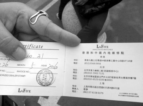 然而,张女士等人回沈后发现,这些所谓的“名表”根本就是“三无”产品。一名游客按照“名表”的售后热线打过去,对方称根本就不是什么钟表厂;另一名游客好不容易打通了厂家电话,被告知厂址在广州,同款的手表国内标价仅三四百元,而这名游客购买时花了三四千元。