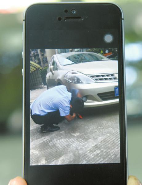 孙先生展示物管人员10日锁车的照片。