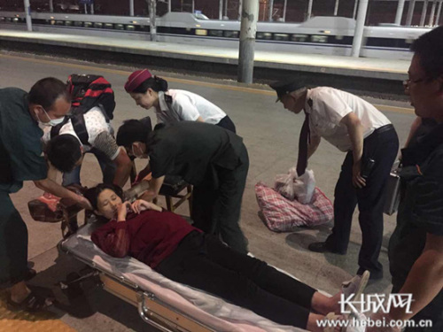 21时22分,列车停靠石家庄站,当时孕妇已是脸色苍白,疼痛难忍,车站工作人员赵龙和焦楠与赶到的120急救人员立即上前进行安抚并立刻将其抬上担架,通过早已安排好的绿色通道送往医院进行救治。