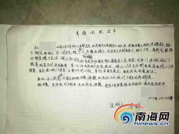 “当时孩子说是中午睡觉时候不听话,就被老师打了,然后头撞在了墙上……”姚先生称。为了证明此事,姚先生还拿出了一份当事教师写的一份“事情经过书”。