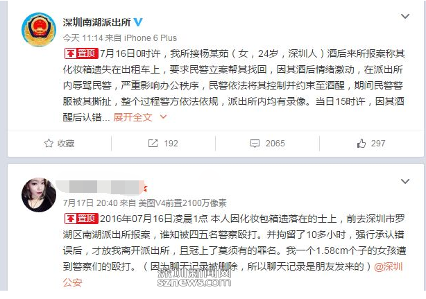 7月17日晚上有网友发微博称,16日凌晨1点,因化妆包箱遗落在出租车上,因此去深圳市罗湖区南湖派出所报案,被四五名警察殴打,并拘留了10多小时,强行承认错误后,才被允许离开派出所。