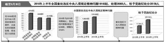 4天后,中央纪委监察部网站通报称,截至6月30日,2016年上半年全国查处违反中央八项规定精神问题19160起,处理26900人,给予党政纪处分20159人。