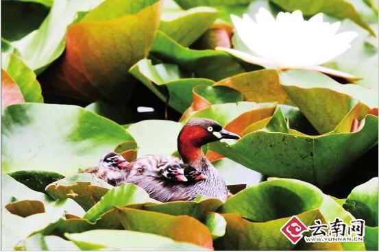 近日在昆明植物园,一对䴙䴘经选址、筑巢、生蛋、孵化,辛辛苦苦一个月,3只小䴙䴘一起出窝,游向了池塘里。䴙䴘在昆明的翠湖和滇池里分布广泛,但很少有人看到它们生儿育女的全过程,6月初,摄影发烧友发现了这对䴙䴘藏在睡莲叶子里的鸟巢,离岸边只有30米左右,于是近距离观察了一个月,拍下了它们一家活动的全过程。