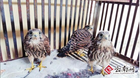 日前,德钦县奔子栏镇叶日村修乡村公路时,达日石膏厂的挖掘机在一堵悬崖之间作业,无意中将一窝幼小的灰背隼从悬崖上铲下来。这3只国家二级保护动物灰背隼嘴角成黄色,属于尚未出窝的幼鸟,而今已经送到白马雪山国家级自然保护区奔子栏管理所喂养。近日记者见到这3只灰背隼已经长大,健康状况良好,再过1个月就可以放归自然了。奔子栏管理所之前还营救过3只灰狼、2只苏门羚、4只藏马鸡和一些麂子。