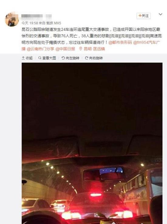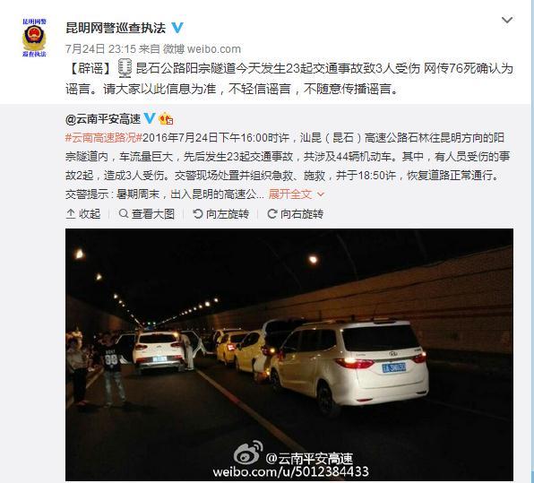24日夜间,昆明网警发布辟谣声明称,“昆石公路阳宗隧道今天发生23起交通事故致3人受伤,网传‘76死’确认为谣言。请大家以此信息为准,不轻信谣言,不随意传播谣言。”