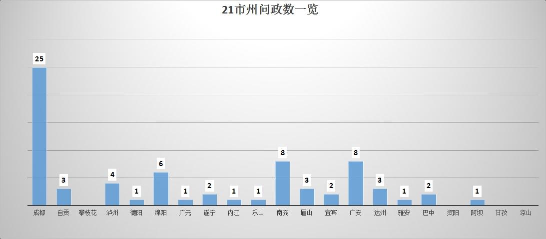 从当期网友问政留言数量看,位居前三的市(州)分别是:成都以25条排名第一,南充、广安分别以8条并列排名第二,绵阳以6条排名第三。