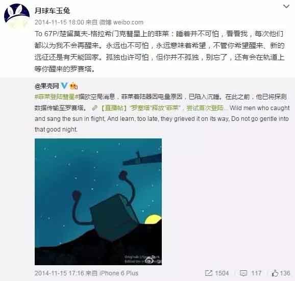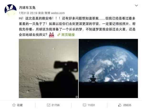 玉兔月球车在7月31日,最后一次跟它的60万粉丝说再见,道晚安。它说:“月球说为我准备了一个长长的梦,不知道梦里我会跃迁去火星,还是会回地球去找师父?”