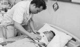 8月1日上午,肖明的姐姐用棉签沾水给病床上的弟弟涂抹嘴唇,年长肖明6岁的姐姐轻手轻脚,静静地望着病床上的弟弟。