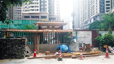 昨日上午,记者来到杨箕村泰兴直街60号,发现玉虚宫几乎是“断壁残垣”,与周围新建的高楼大厦极不协调。玉虚宫铁门紧闭,没有工人在现场施工。铁门外堆放着建筑垃圾和一些堆砌整齐的砖头。
