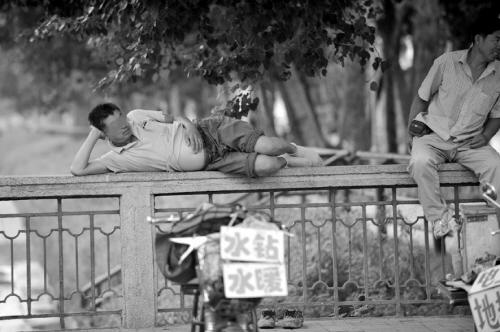 8月14日,在南运河鲁园零工市场附近,一位务工者选择在护栏上侧卧入睡,他的身后便是运河河道。