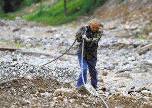 ■从石家庄赶往井陉南峪镇的通信部门工作人员,正在清理河道内的旧电话线。