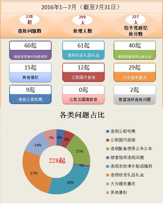 参与互动 云南网讯 据云南省纪委监察厅网站消息:今年1至7月,云南省各级纪检监察机关查处违反中央八项规定精神问题228起,处理290人,给予党政纪处分227人。从查处问题类别看,违规发放津补贴或福利问题60起,占26.3%;违规收送礼品礼金问题61起,占26.7%;违规配备使用公务用车问题40起,占17.5%;大办婚丧喜庆问题29起,占12.7%;违规公款吃喝问题9起,占4%;公款国内旅游问题12起,占5.2%;楼堂馆所违规问题2起,占1%;其他问题15起,占6.6%。(来源:云南省纪委)