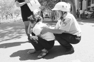 骑电动车的白衣女士一直无法起身,一位协警便蹲在其身后,用身体当靠垫,帮倒地的女士稳定姿势。记者看到,在交警的疏导下,拥堵的交通逐渐恢复畅通。一旁,驾驶汽车的女司机也很尽责,她一面帮着联系120,一面搀扶倒地女子,一脸的焦急关切。很快,120赶到现场,几位交警又同救护人员一起,将伤者抬上救护车,看着救护车离去,几人才离开了现场。