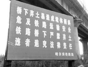 在南侧桥下,哈尔滨铁路局矗立的警示牌上明示:“桥下弃土易造成桥墩倾斜危及铁路运输安全,铁路桥下严禁弃土,违者追究法律责任”等字样。