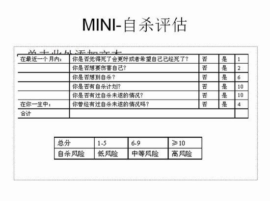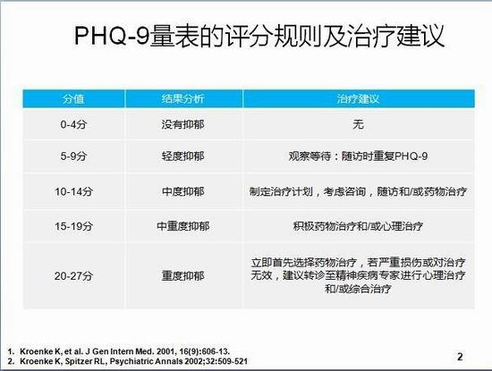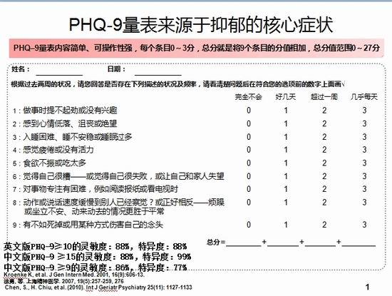 目前,在网上有很多用于自我评估是否患有抑郁症的问卷以及小测试,那么,这些测试科学吗?据邱昌建介绍,在做这些自我评估时不要过于迷信和对号入座,如果觉得自己有问题,还是得到正规医院就诊,由精神专科医生来做科学评估。(文后附邱昌建提供的国际专业测试量表)