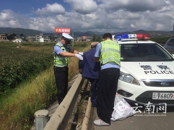 17上午11时许,楚大高速路交警大队民警在辖区高速公路开展日常巡逻工作,巡逻至大理往昆明方向K112+300M路段时发现一名老翁在高速公路边上捡拾路上的空饮料瓶,随时有可能被路上高速行驶的车辆撞到,情况十分危急。