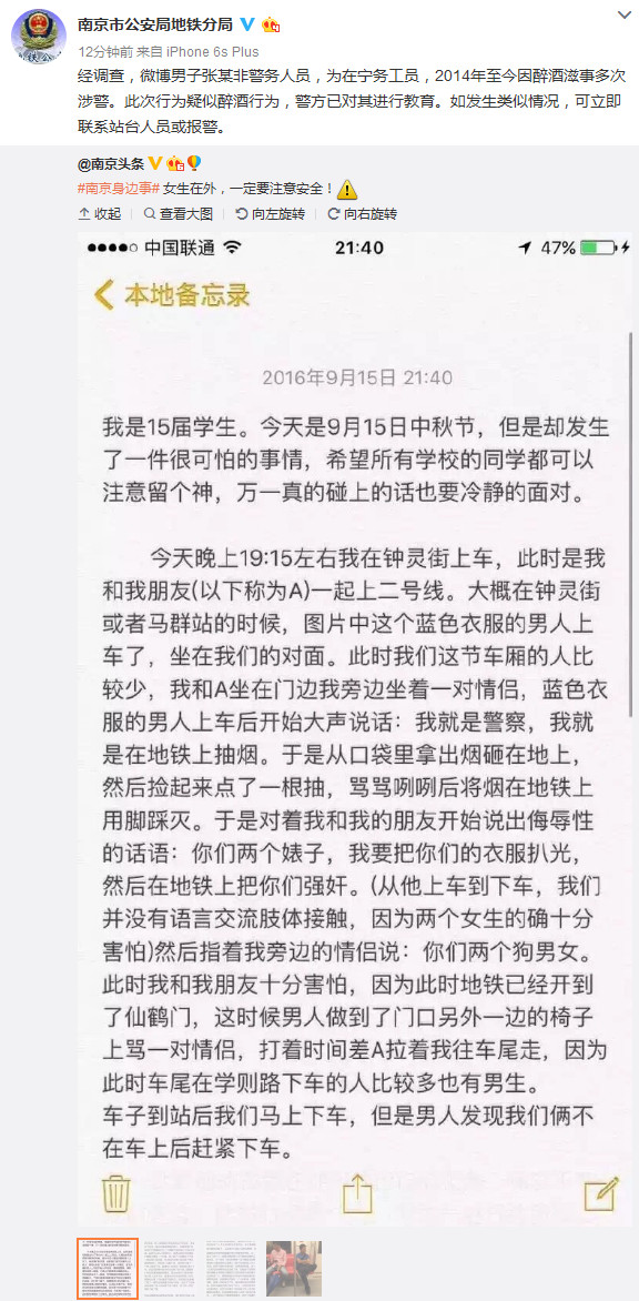 中新网9月20日电 近日有网友爆料,两名女学生在南京地铁上遭一自称警察的男子持续语言侮辱,南京市公安局地铁分局官方微博今日发布消息称,该男子非警务人员,其2014年至今因醉酒滋事多次涉警。此次行为疑似醉酒行为,警方已对其进行教育。