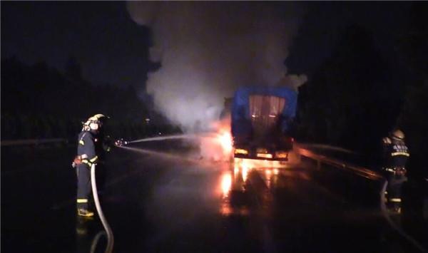 到达现场后,消防队员发现,一辆满载煤炭的大货车正烧着熊熊大火,着火部位是货车两边的六个轮胎,车内煤炭并未燃烧,车内并无人员被困。由于是夜间且在高速路上,救援队员一边配合交警、路政人员设置警戒,一边开展灭火救援工作。15分钟后,火势被成功扑灭。由于现场温度过高,为防止车内煤炭燃烧,消防队员又继续对车辆降温,直到车辆冷却中队才返回。