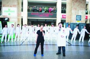 “这是心的呼唤,这是爱的奉献……”9时30分许,从在吉大一院2号楼门诊大厅内传来阵阵深情动听的歌声,两名身穿白色、绿色工作制服的医护人员一边动情高歌,一边微笑着从人群中走向舞台中央,引来台下阵阵欢呼声和掌声。