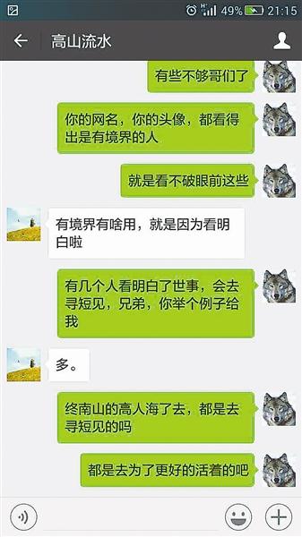 “跳楼算啦”、“坚持不了了,死了也好”……11月12日晚,身在陕西的王先生怎么也睡不着,微信里23岁邛崃小伙徐超(化名),不断表达着自己的“死意已决”。这让他变得紧张而担心,他不停地通过微信发去劝说信息,同时两次向四川警方报警,希望小伙能够放弃轻生的念头。而其实两人并不相识,“只是通过一个帖子偶然结识的,甚至不知道他的名字。”王先生说。