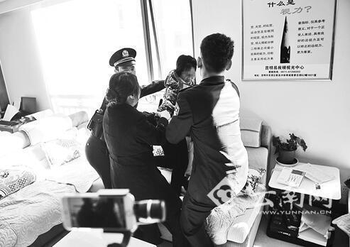 14日,昆明市官渡区人民法院执行法官一行到新亚洲体育城附近的星都总部基地小区强制腾房时,一直占着房子的案外女子和母亲打开窗子说要跳楼,法警去拉她,反被她咬伤手臂。被戴上手铐后,她飞起一脚踢碎一个大花瓶,法官好心相劝,她却毫不领情地说:“花瓶是我的,我爱怎么砸就怎么砸,你们管不着。”被强行带进电梯时,她又猛地一跳,跺得电梯迅速下沉,还说要与法官同归于尽……