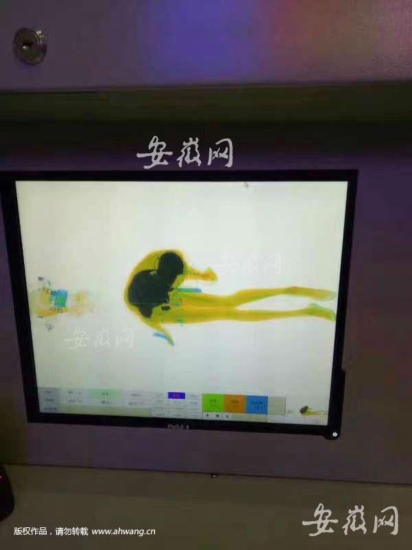 就几秒钟的时间,男子和行李一起进入了安检仪。这时,与安检仪相连的电脑立刻显示出这幅“抽象派图画”,把盯着屏幕的工作人员吓了一跳。